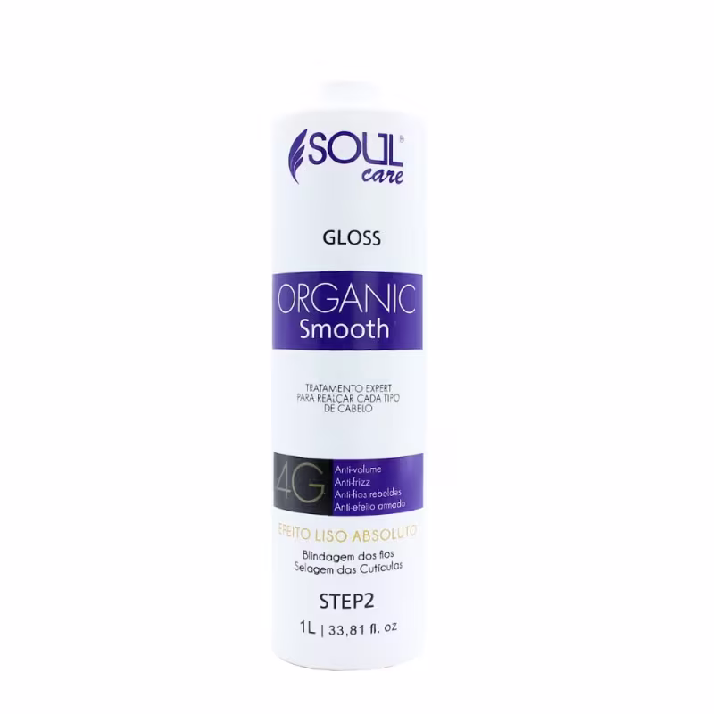 Tratamento gloss para selagem de cutículas. Soul Care Organic Smooth Step 2 é o segundo passo da escova progressiva, para uma transformação capilar segura e eficaz sem formol.