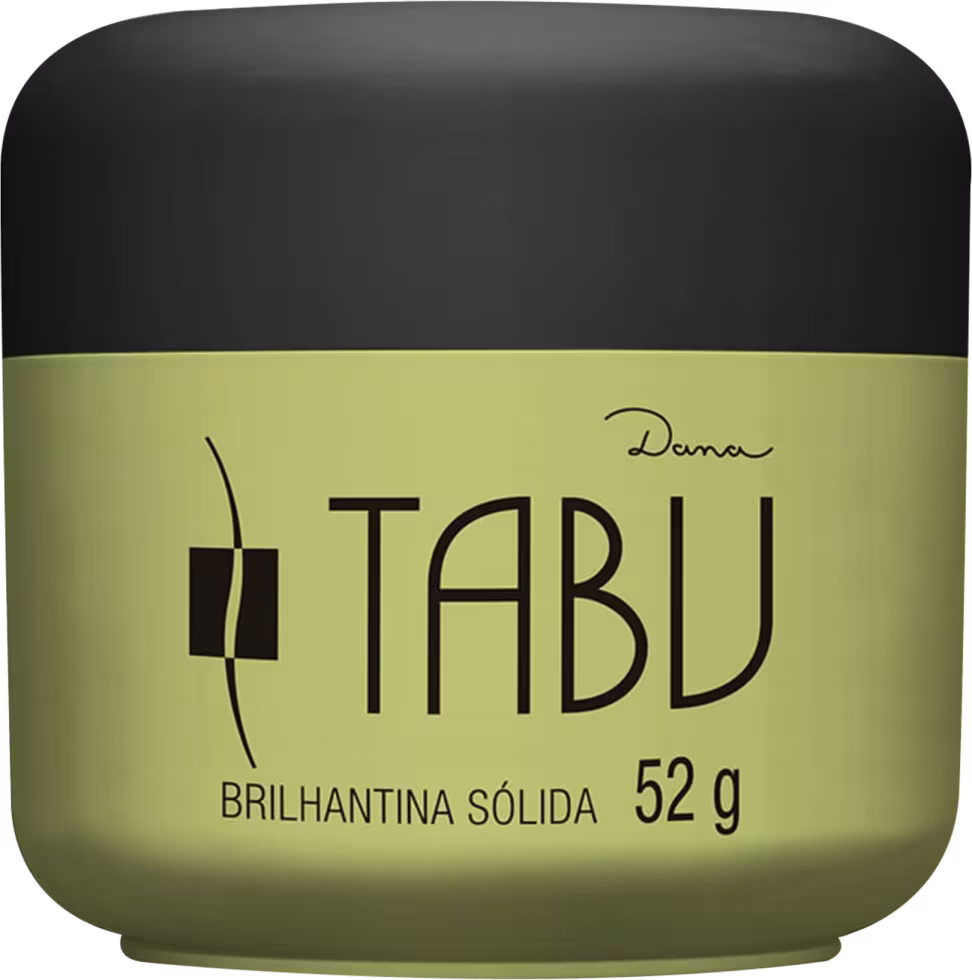 Brilhantina para modelar cabelos. Tabu garante vigor e brilho, favorecendo o penteado dos sonhos.