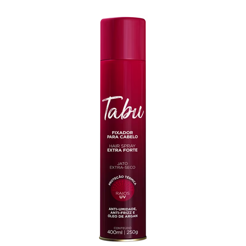 O Spray Fixador Tabu Extra Forte possui poderosa ação anti-umidade e anti-frizz, além de proteção térmica, anti-raios UV. Com sua fórmula elaborada a partir do Óleo de Argan, propicia hidratação das fibras capilares, além de controlar os fios indisciplinados. Além disso, pode ser removido facilmente com água, sem deixar resíduos.