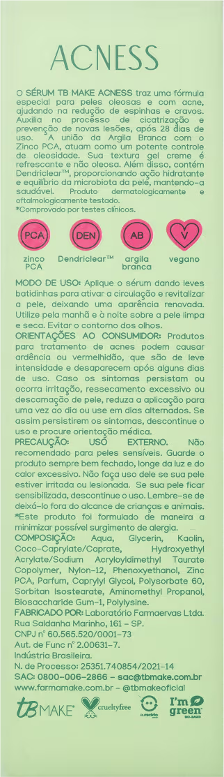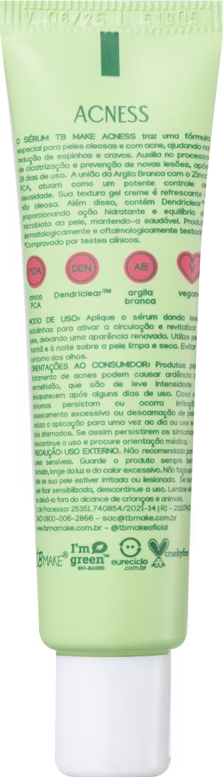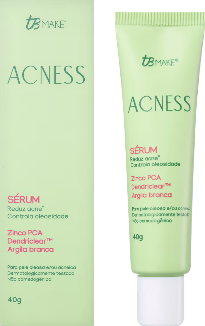 O Sérum Facial TB Make Acness possui textura gel creme, é refrescante e não deixa a pele com aspecto oleoso. Sua fórmula conta com Argila Branca e Zinco PCA que atuam como um potente controle de oleosidade, e DendriclearTM que proporciona ação hidratante e o equilíbrio da microbiota da pele. É dermatologicamente e oftalmologicamente testado.