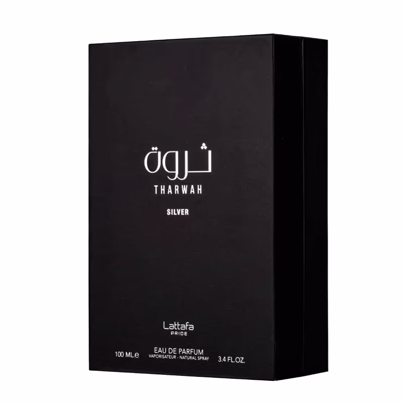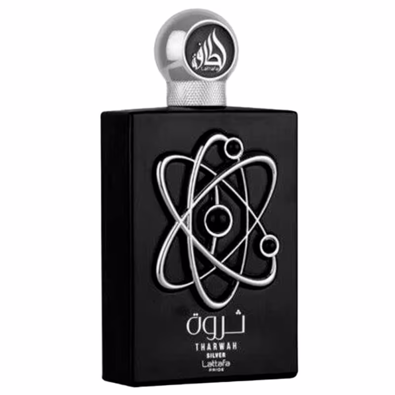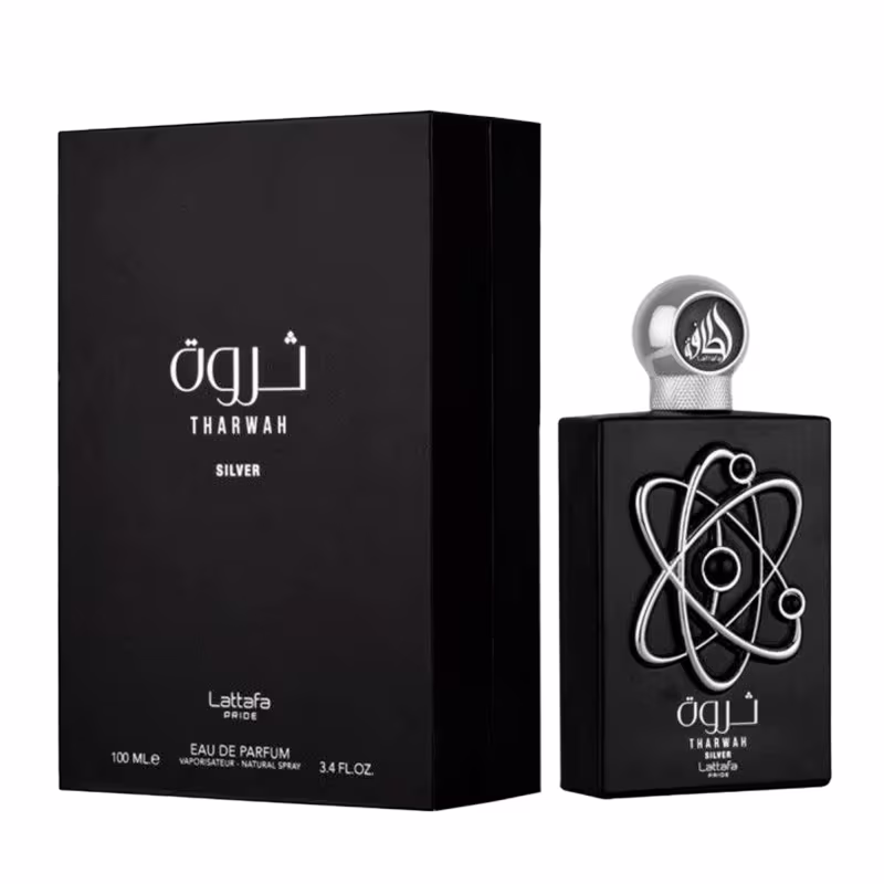 Tharwah Silver é um Eau de Parfum Lattafa unissex floral amadeirada almiscarada. traz uma inesquecível fragrância sofisticada e cativante.