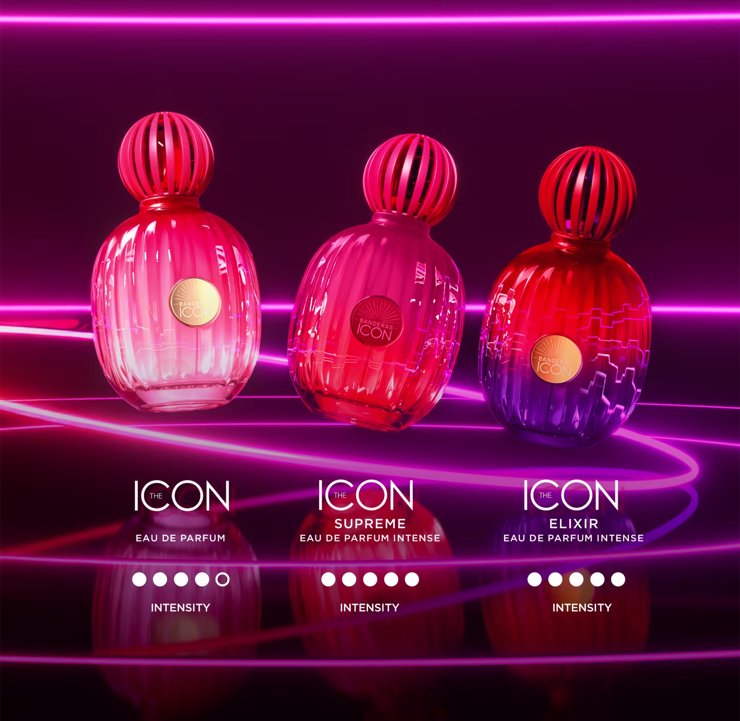 The Icon Elixir é um Eau de Parfum Intense Banderas feminino âmbar amadeirado. Uma declaração potente de força, elegância e mistério.