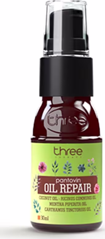 O Óleo Three Therapy Pantovin Oil Repair Oil Repair é um complexo concentrado de óleos botânicos, altamente nutritivos, riquíssimos e umectantes que tratam os fio, restaurando a elasticidade e a saúde.
