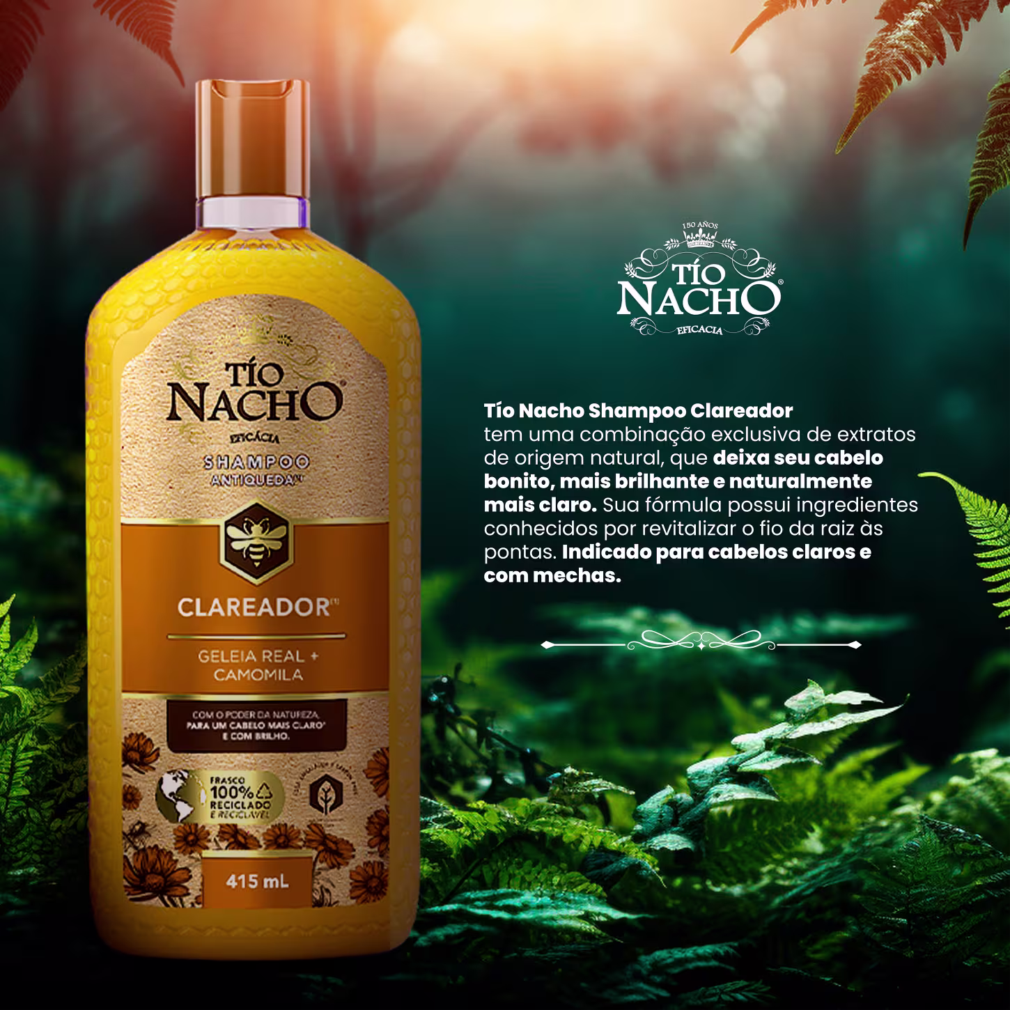 O Shampoo Tío Nacho Clareador conta com Geleia Real, Camomila e Extratos de Origem Natural. Limpa, hidrata a fibra capilar, proporciona brilho e suavidade. Além disso, ajuda a clarear natural os fios, revitalizando e nutrindo intensamente.