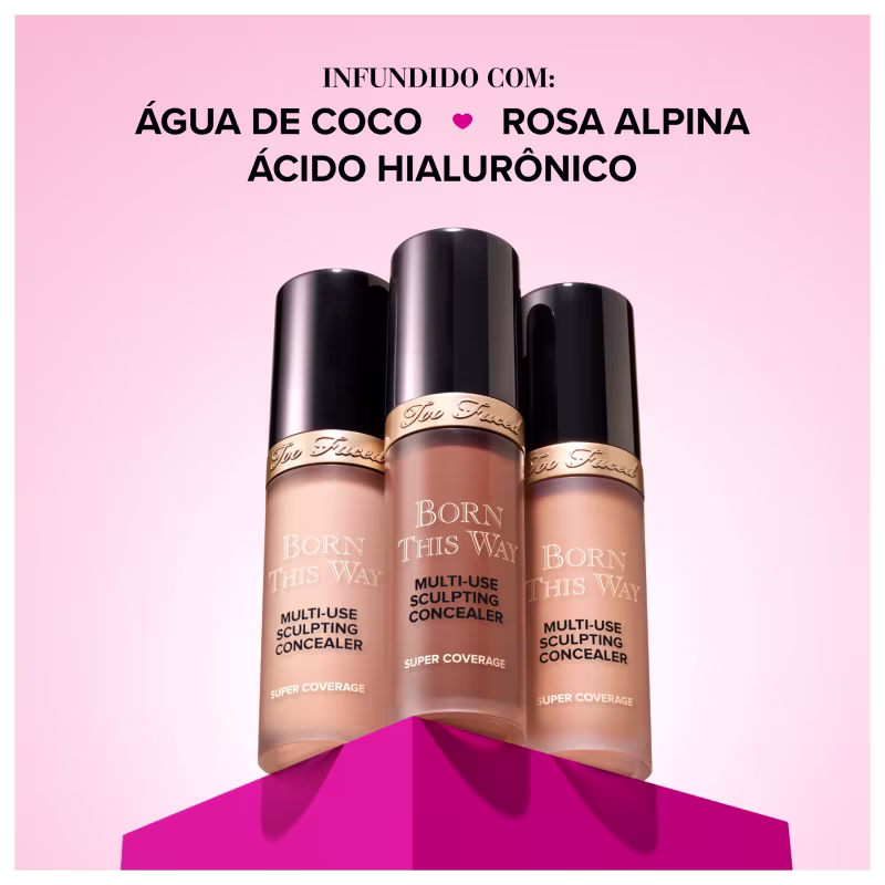 O Corretivo Too Faced Born This Way Super Coverage tem fórmula multiuso definitiva, enriquecida com Rosa Alpina, Água de coco e Ácido Hialurônico, com alta pigmentação e cobertura para um efeito de acabamento indetectável, como se essa fosse a sua pele desde que nasceu. Não estoura no flash!