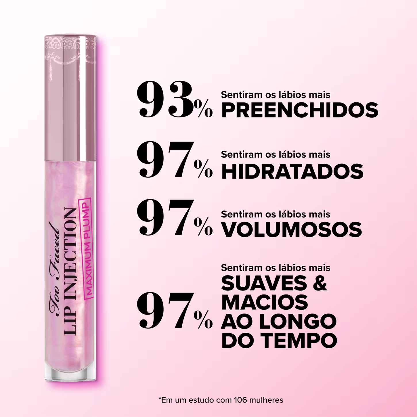 O Gloss Labial Too Faced Lip Injection Maximum Plump traz fórmula enriquecida com um blend ultra hidratante de Óleo de Abacate e Jojoba, restaura a maciez da pele imediatamente. Promove volume, hidratação e condicionamento com brilho rosado suave aos seus lábios.