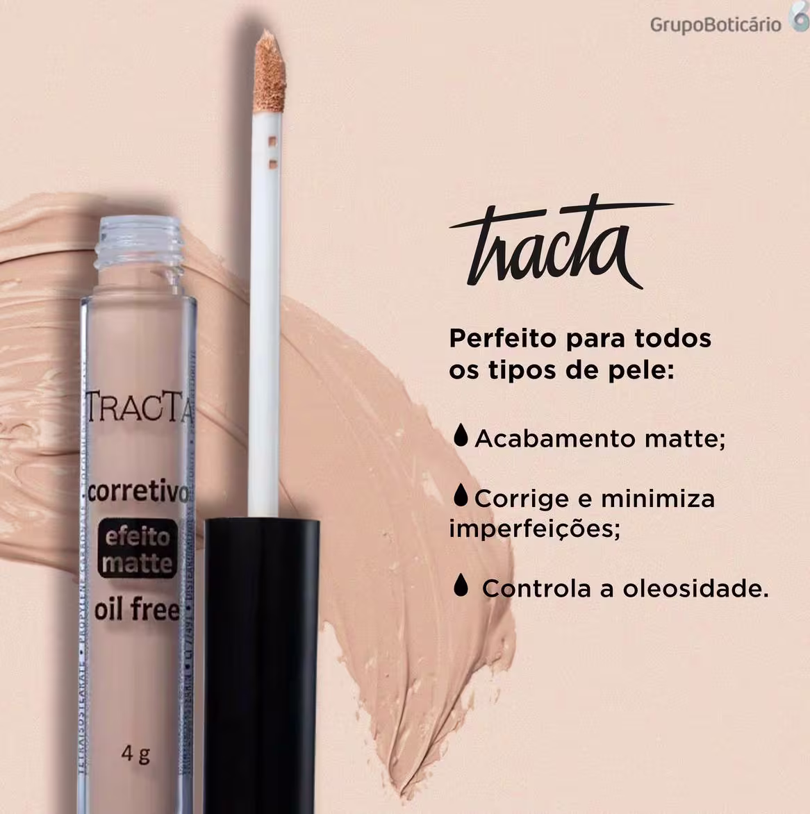 Corretivo com efeito matte para todos os tipos de pele. Tracta Efeito Matte corrige e minimiza manchas e imperfeições, além de disfarçar a oleosidade.