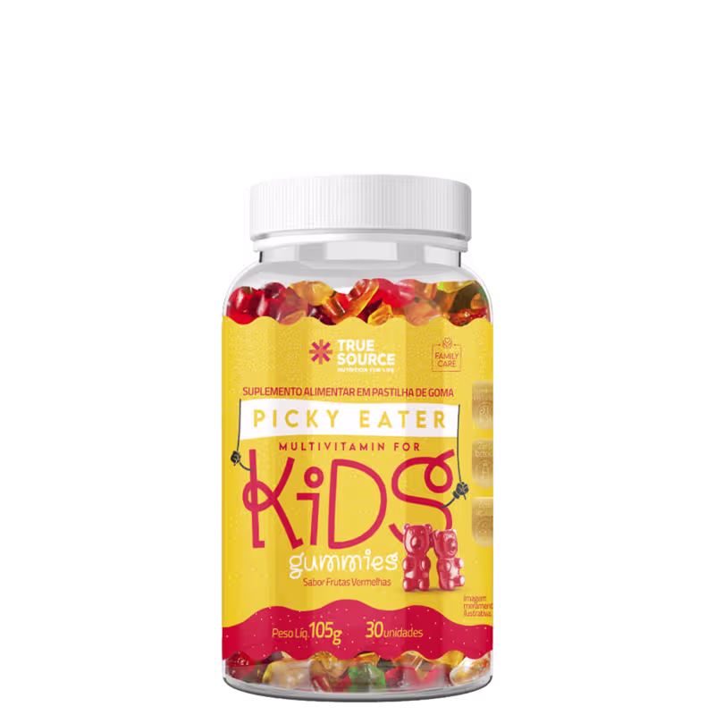 Suplemento alimentar infantil. True Source Picky Eater Kids Multivitamínico oferece suporte nutricional adequado às necessidades desses pequenos.