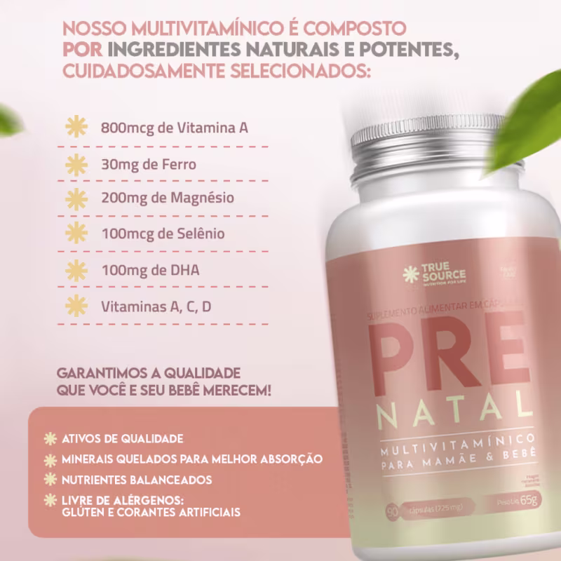 O Suplemento Multivitamínico True Source Pré Natal Vitamin combina os melhores e mais potentes nutrientes para garantir uma gestação saudável e tranquila. Sua fórmula exclusiva oferece vitalidade a nível celular, fundamental para que a mamãe tenha mais disposição e energia para aproveitar cada momento dessa fase única. Além disso, fortalece a saúde imunológica e óssea da mãe, protege o desenvolvimento do bebê desde as primeiras semanas e contribui para a formação saudável do cérebro e do tubo neural, essencial no primeiro trimestre da gestação.