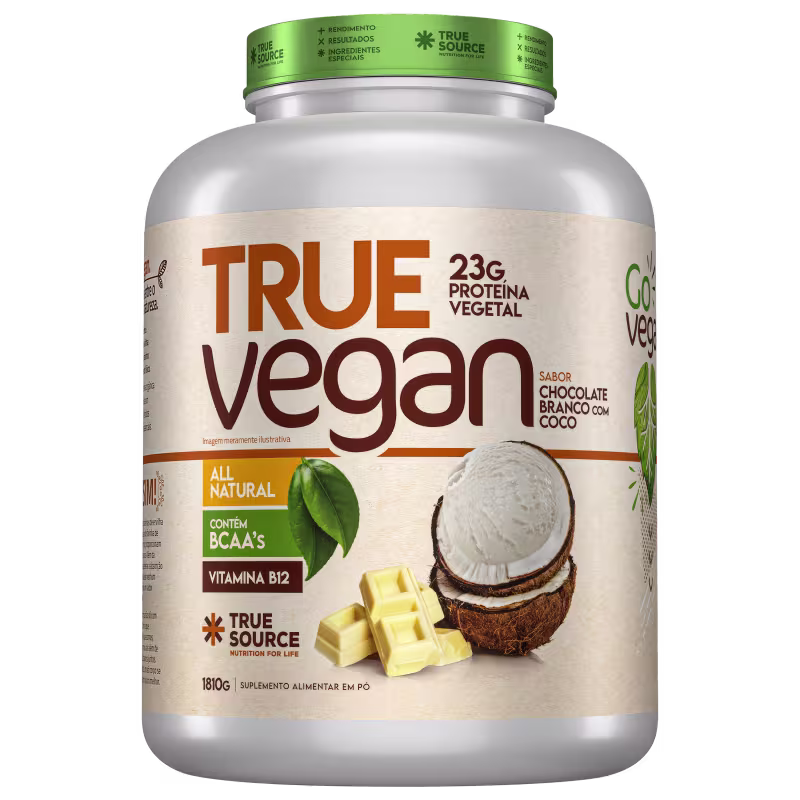 Suplemento alimentar vegano. True Source True Vegan Chocolate Branco com Coco fornece 100% da necessidade diária de vitamina B12, essencial para veganos e vegetarianos.