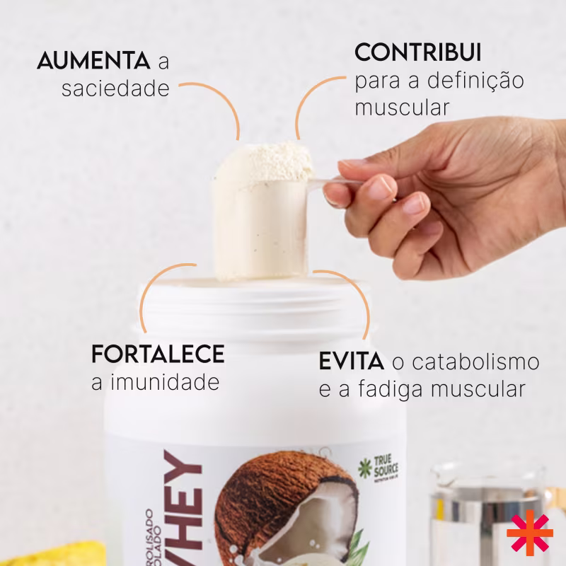 Suplemento alimentar em pó. True Source True Whey Protein Coconut Ice Cream possui fórmula rica em proteínas e gorduras boas proporciona a sensação de saciedade por mais tempo, controlando o apetite e auxiliando na perda de peso.