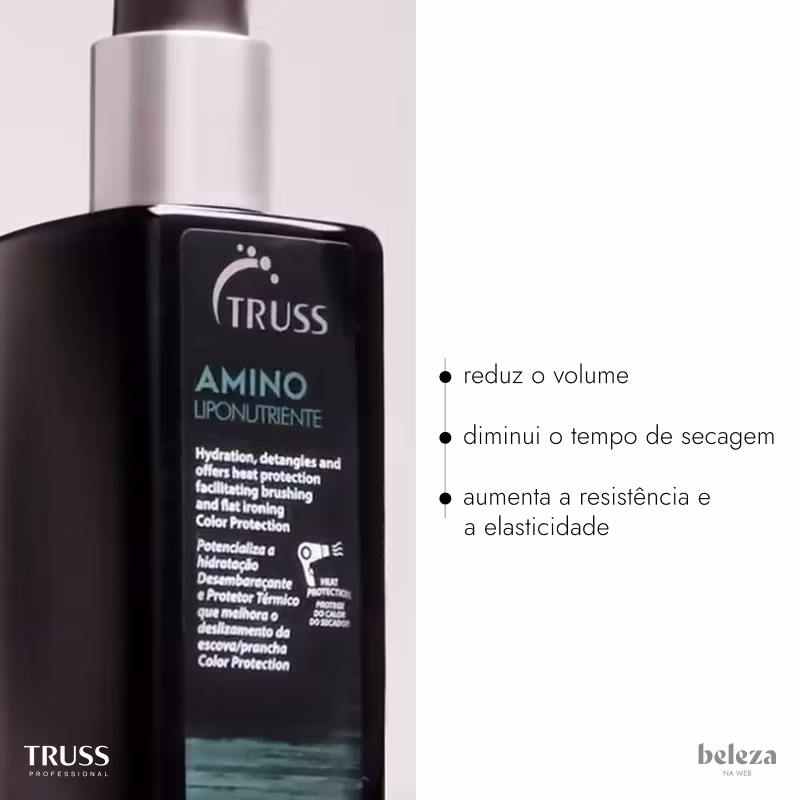 Protetor térmico para todos os tipos de cabelo. TRUSS Amino diminui o tempo de secagem dos fios e evita os danos causados pelo calor do secador e da prancha.