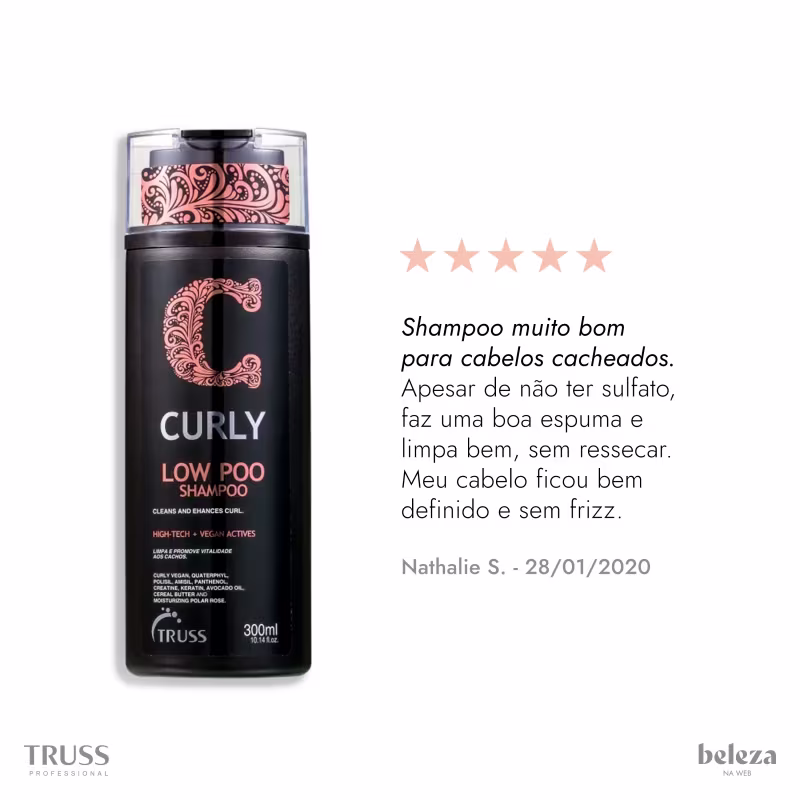 O Shampoo Curly Low Poo Truss consegue combater o ressecamento para que o cabelo tenha uma aparência saudável. Sua fórmula ainda fixa o formato dos cachos e protege do frizz. Tudo isso sem pesar ou deixar oleoso.