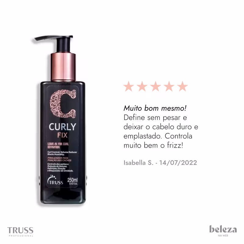 O Ativador de cachos Truss Curly Fix também bloqueia a umidade externa para reduzir o frizz, além de ajudar a aumentar a resistência dos fios. Com ele, seus cachos ficam impecáveis por muito mais tempo.