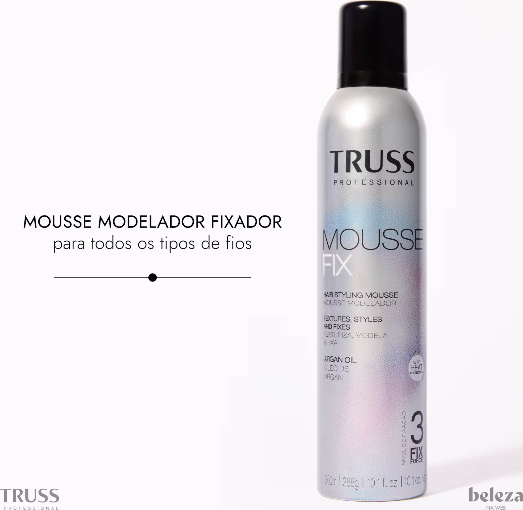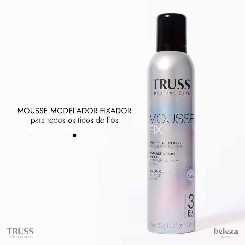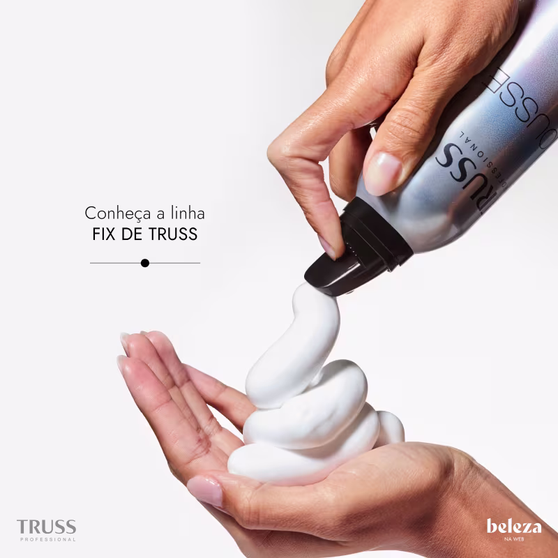 Mousse modelador. TRUSS Mousse Fix texturiza, modela e fixa o penteado, mantendo a maleabilidade e maciez dos fios. Possui propriedades condicionantes, garantindo maciez máxima, nutrição, brilho e proteção.