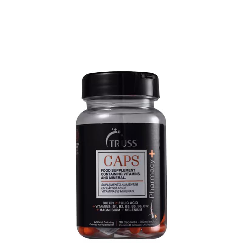 Suplemento Alimentar Truss Pharmacy+ Caps é rico em vitaminas e minerais, sendo de rápida absorção, para ajudar no fortalecimento dos fios e na hidratação interna da fibra capilar. Indicado para homens e mulheres, promove aumento da resistência do cabelo e brilho. Com ele, seus fios ficam fortes, nutridos e bonitos.