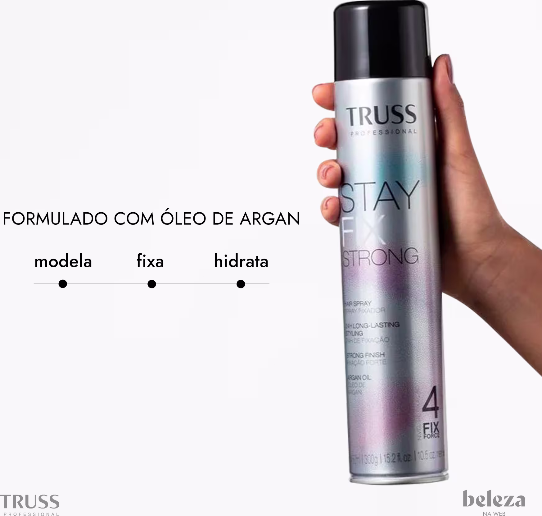 O Spray Fixador TRUSS Stay Fix Strong conta com Óleo de Argan altamente nutritivo e uma fórmula que protege do frizz. Oferece uma fixação intensa, que garante a resistência e a permanência do penteado por mais tempo.