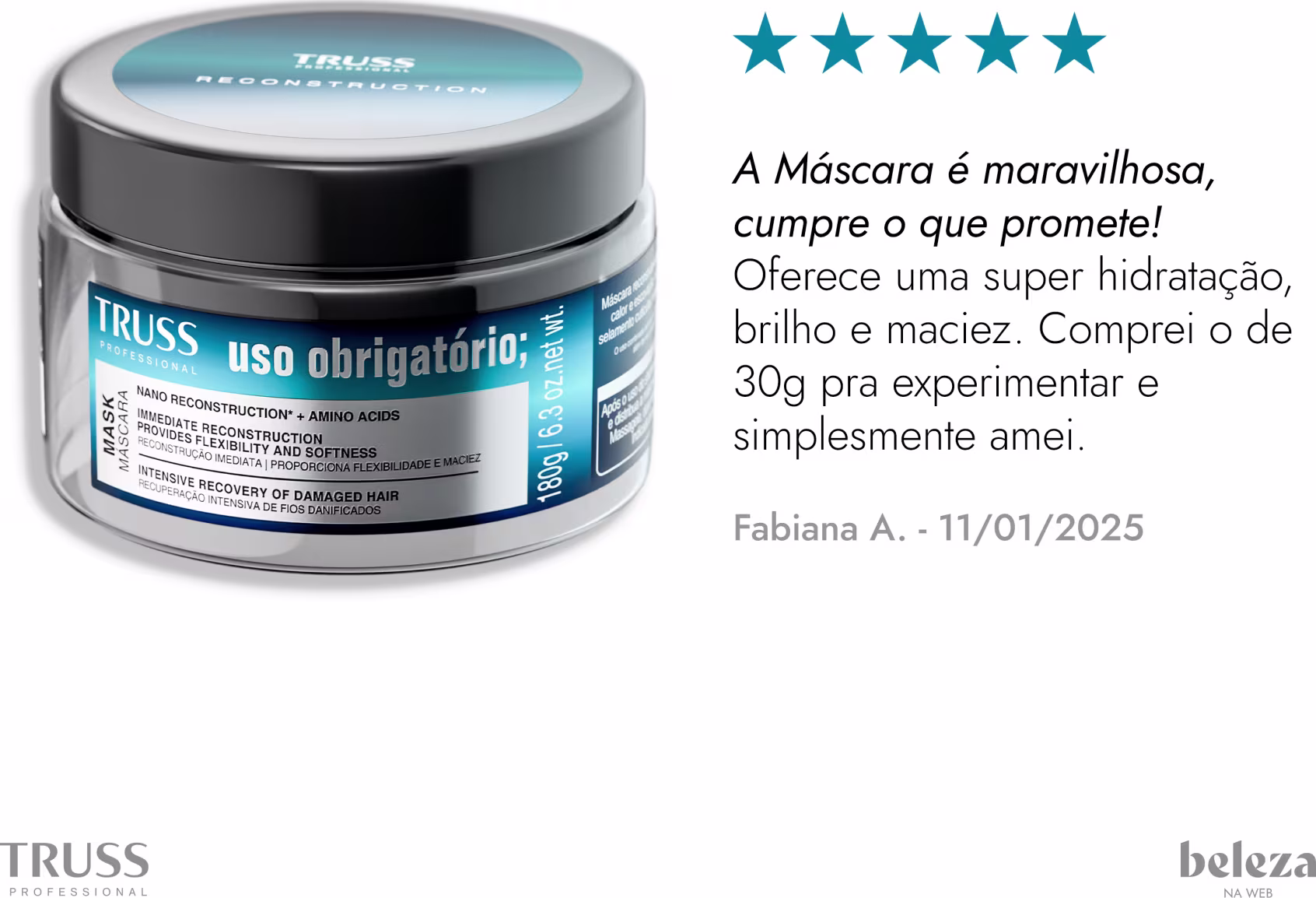 Máscara de Tratamento TRUSS Uso Obrigatório: promove reestruturação da fibra capilar. Melhores Tratamentos da TRUSS na BLZ. Ver mais ❯