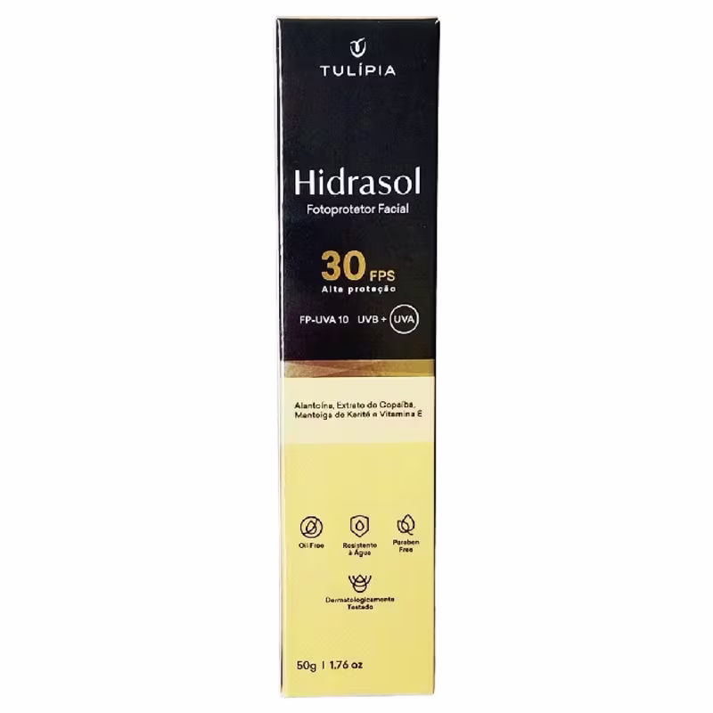O Protetor Solar Facial Tulípia Cosméticos Hidrasol FPS 30 PPD 20 proporciona alta proteção contra os raios UV. Contém uma fórmula enriquecida com ativos antioxidantes, como Alantoína, Manteiga de Cupuaçu, Óleo de Copaíba e Vitamina E, que previnem o fotoenvelhecimento. Totalmente livre de óleos, possui toque seco e fácil espalhabilidade, podendo ser utilizado em peles sensíveis. Proporciona uma proteção eficaz, deixando a pele hidratada e protegida contra os danos causados pela exposição solar.