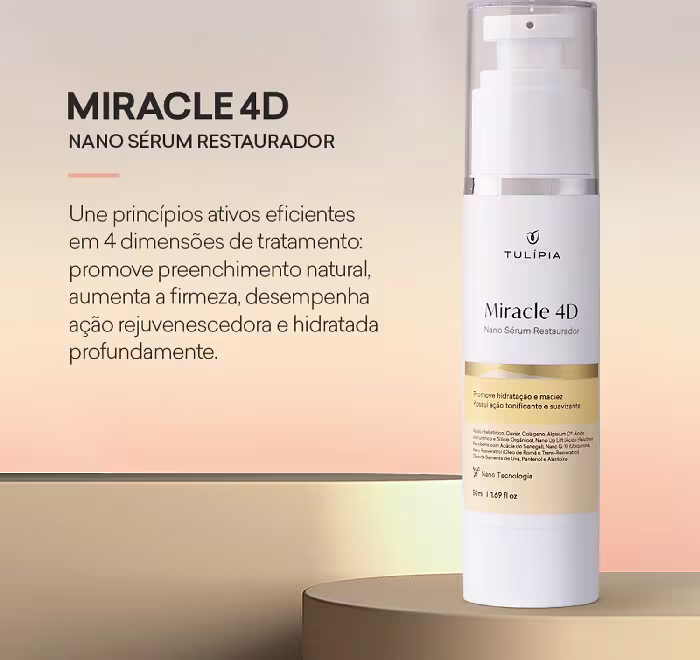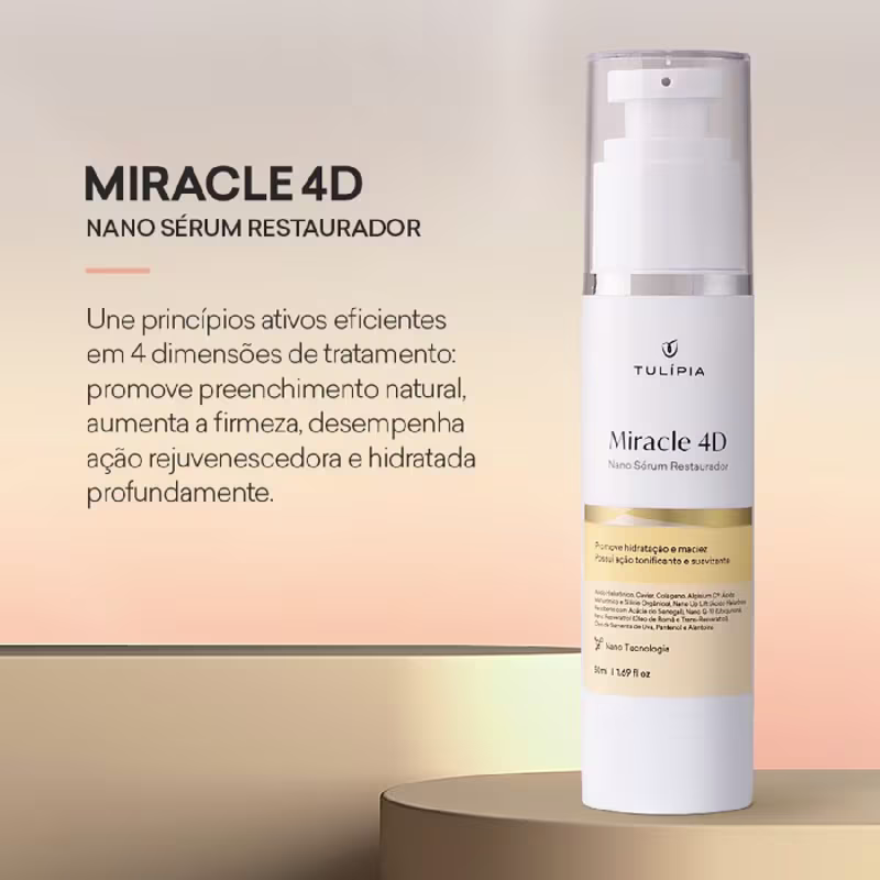 O Sérum Restaurador Facial Tulípia Cosméticos Miracle 4D une princípios ativos eficientes em 4 dimensões de tratamento: promove preenchimento natural, aumenta a firmeza, desempenha ação rejuvenescedora e hidrata profundamente, restaurando a saúde e a beleza da pele.