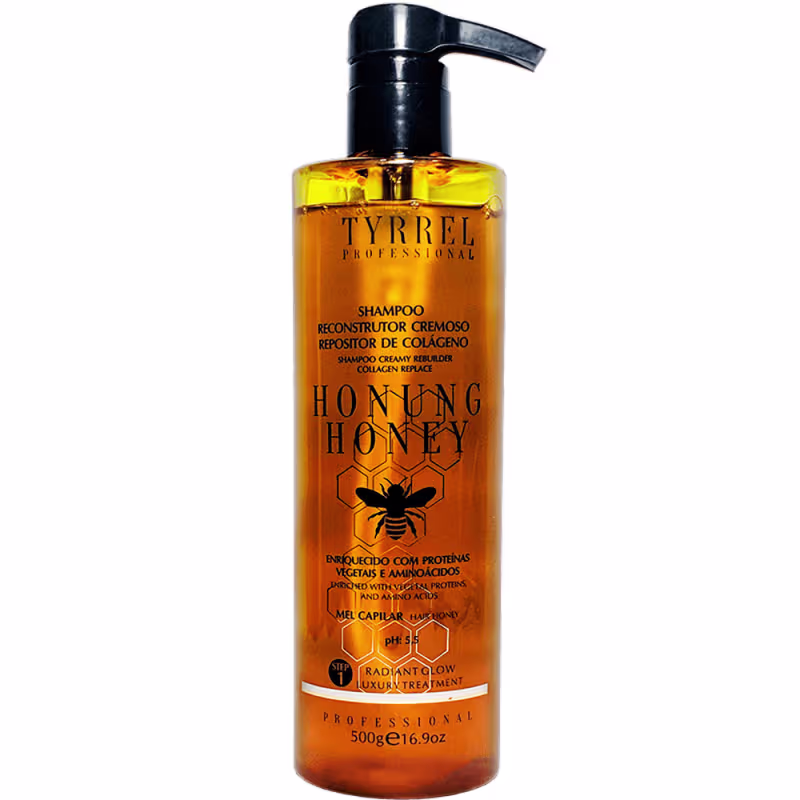 O Shampoo Tyrrel Professional Honung Honey traz de volta o colágeno perdido, proporcionando elasticidade, hidratação e saúde aos fios.