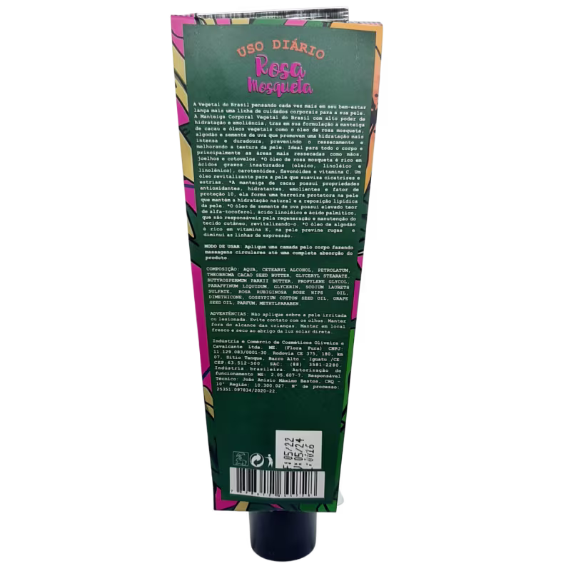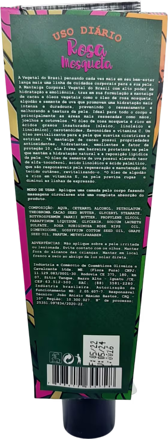 A Manteiga Corporal Vegetal do Brasil Rosa Mosqueta é feita com Óleo de Rosa Mosqueta, que é rico em ácidos graxos insaturados (oleico, linoleico e linolênico), carotenóides, flavonóides e vitamina C. Melhora o ressecamento e textura da pele, ideal para todo o corpo e principalmente as áreas mais ressecadas como mãos, joelhos e cotovelos. É ideal para levar na bolsa e ter sempre por perto.