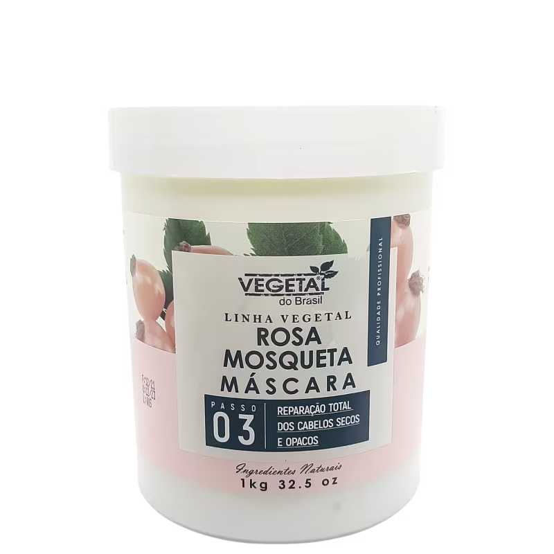 Máscara capilar ideal para cabelos secos e opacos. Vegetal do Brasil Rosa Mosqueta regenera os fios com hidratação e proteção intensa.