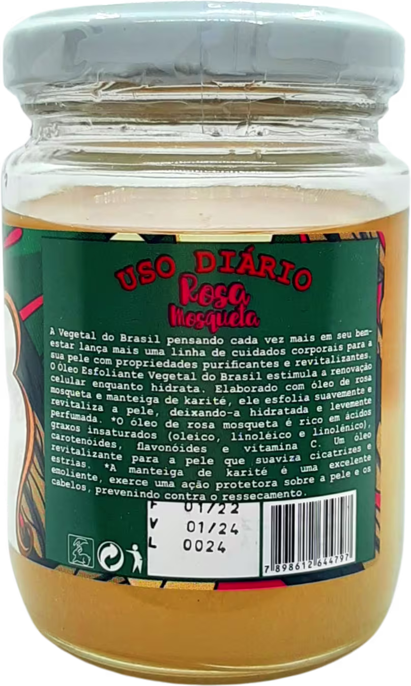 O Óleo Esfoliante Corporal Vegetal do Brasil Rosa Mosqueta é feito com Óleo de Rosa Mosqueta, que é rico em ácidos graxos insaturados (oleico, linoleico e linolênico), carotenóides, flavonóides e vitamina C. Esfolia e revitaliza a pele deixando-a hidratada e levemente perfumada.