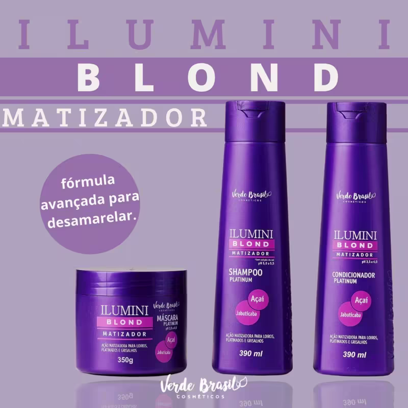 O Condicionador Verde Brasil Cosméticos Ilumini Blond desembaraça os fios enquanto neutraliza os tons amarelados indesejados, realçando o brilho e a cor dos cabelos loiros, com mechas ou grisalhos. Sua fórmula exclusiva combina pigmentos azul e violeta, que atuam diretamente na neutralização dos tons amarelados, com os benefícios nutritivos do Açaí e da Jabuticaba. Rico em Ômegas 3, 6 e 9, o Açaí promove reestruturação, condicionamento e brilho intenso, enquanto a Jabuticaba, rica em Vitamina C, vitaminas do complexo B, ferro e cálcio, fortalece, nutre e devolve a vitalidade perdida aos fios. Para completar, a fórmula conta com a Creatina, que penetra profundamente na fibra capilar, recuperando os danos causados por processos químicos e físicos.
