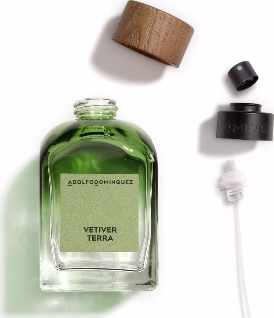 O aroma Vetiver Terra de Adolfo Dominguez une os principais elementos da terra e busca o reencontro com a natureza. Suas notas de saída são o cítrico da bergamota e o toque especial das folhas de figueira, que se combinam com o coração amadeirado de vetiver e cedro. Para o conforto, um fundo de caramelo e almíscar.