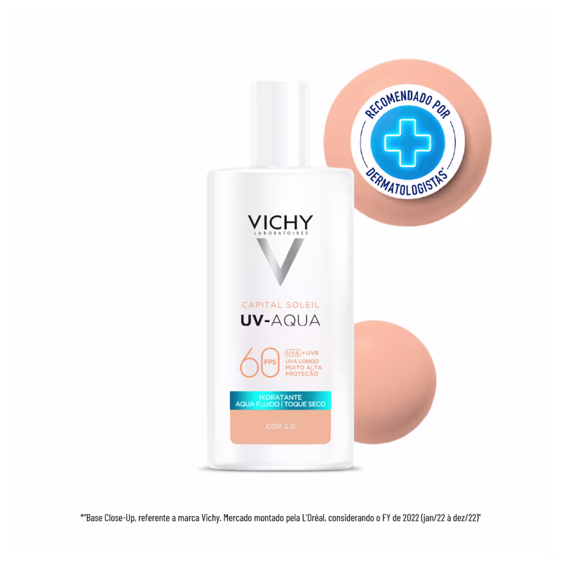 O Protetor Solar com Cor Vichy Capital Soleil UV-Aqua FPS60 se destaca pela combinação de alta proteção UV e cuidado avançado. Indicado para peles mistas e oleosas, conta com Água Vulcânica de Vichy, que fortalece e remineraliza a pele. Seu efeito matte clinicamente comprovado garante controle do brilho por até 16 horas. Ideal para finalizar tratamentos faciais, oferece toque seco e sensação prolongada de pele limpa.