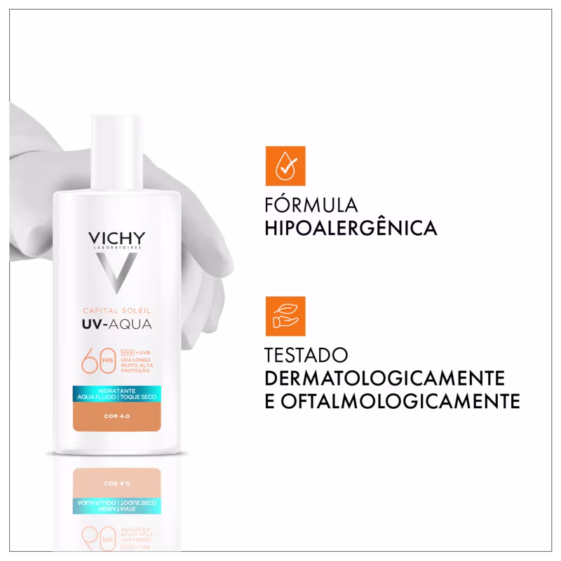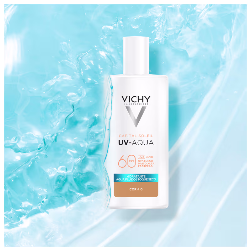 O Protetor Solar com Cor Vichy Capital Soleil UV-Aqua FPS60 se destaca pela combinação de alta proteção UV e cuidado avançado. Indicado para peles mistas e oleosas, conta com Água Vulcânica de Vichy, que fortalece e remineraliza a pele. Seu efeito matte clinicamente comprovado garante controle do brilho por até 16 horas. Ideal para finalizar tratamentos faciais, oferece toque seco e sensação prolongada de pele limpa.