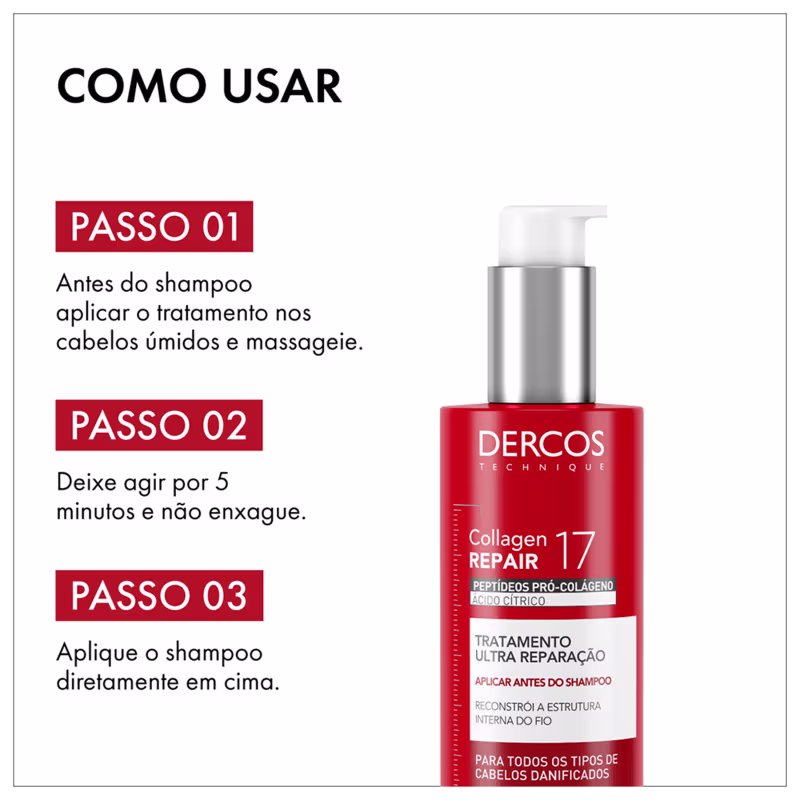 Não sei o CEPTratamento pré-shampoo para todos os tipos de cabelos. Vichy Dercos Collagen Repair 17 traz fórmula avançada fortalece os fios desde a raiz, proporcionando máxima reparação e resistência, ideal para quem busca revitalizar a saúde capilar.