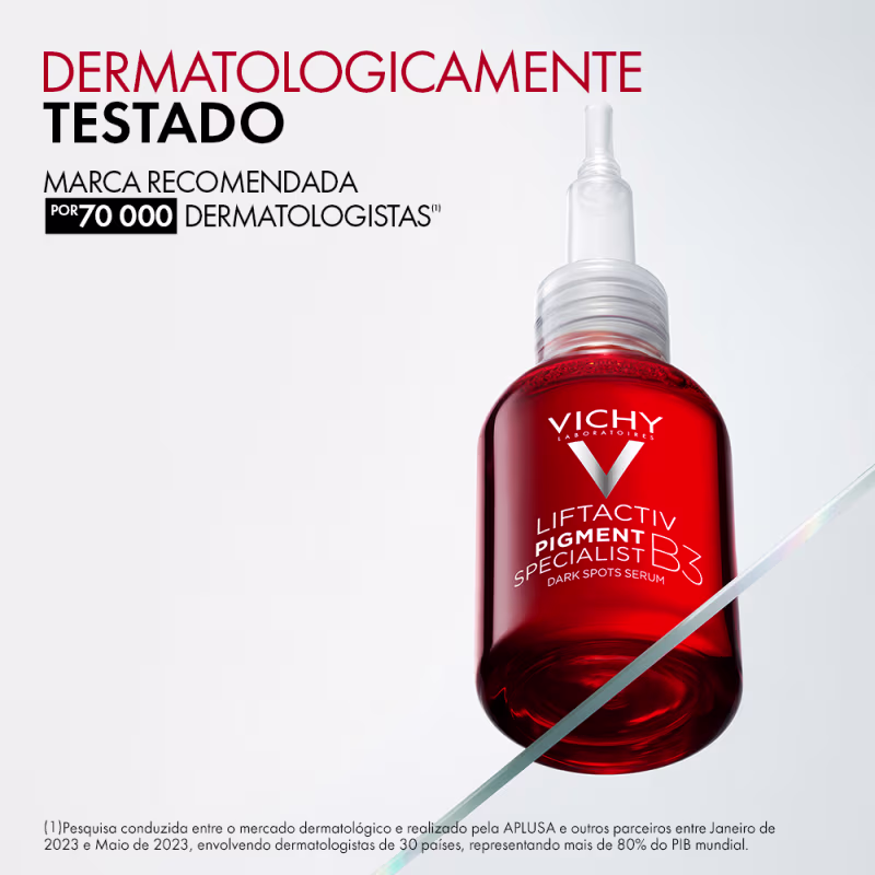 Sérum antimanchas para todos os tipos de pele, inclusive as oleosas. Vichy Liftactiv Pigment Specialist B3 uniformiza o tom da pele e corrige rugas.