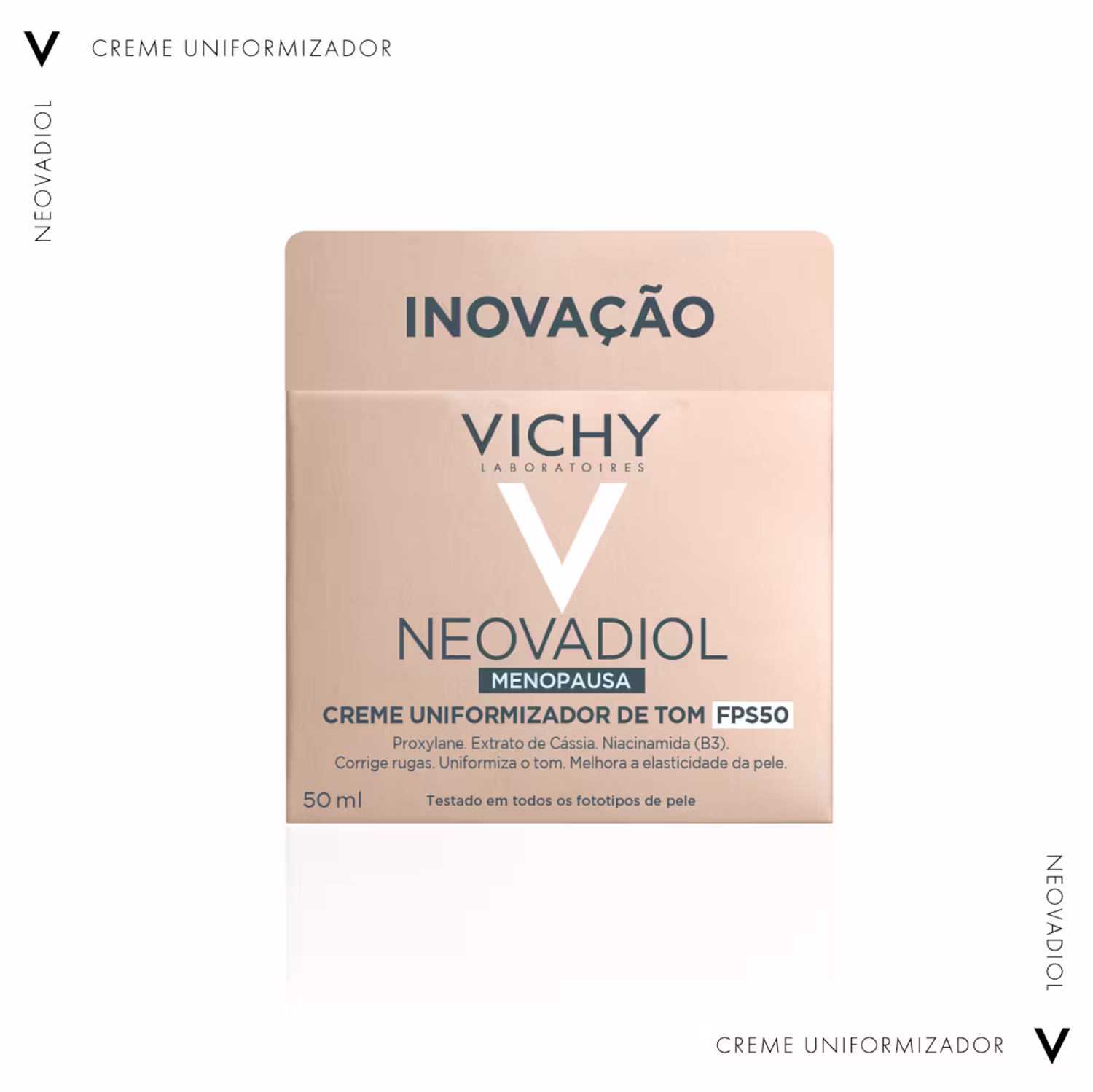 Creme uniformizador facial. Vichy Neovadiol Menopausa FPS50 auxilia na compensação dos impactos da menopausa e da exposição solar.