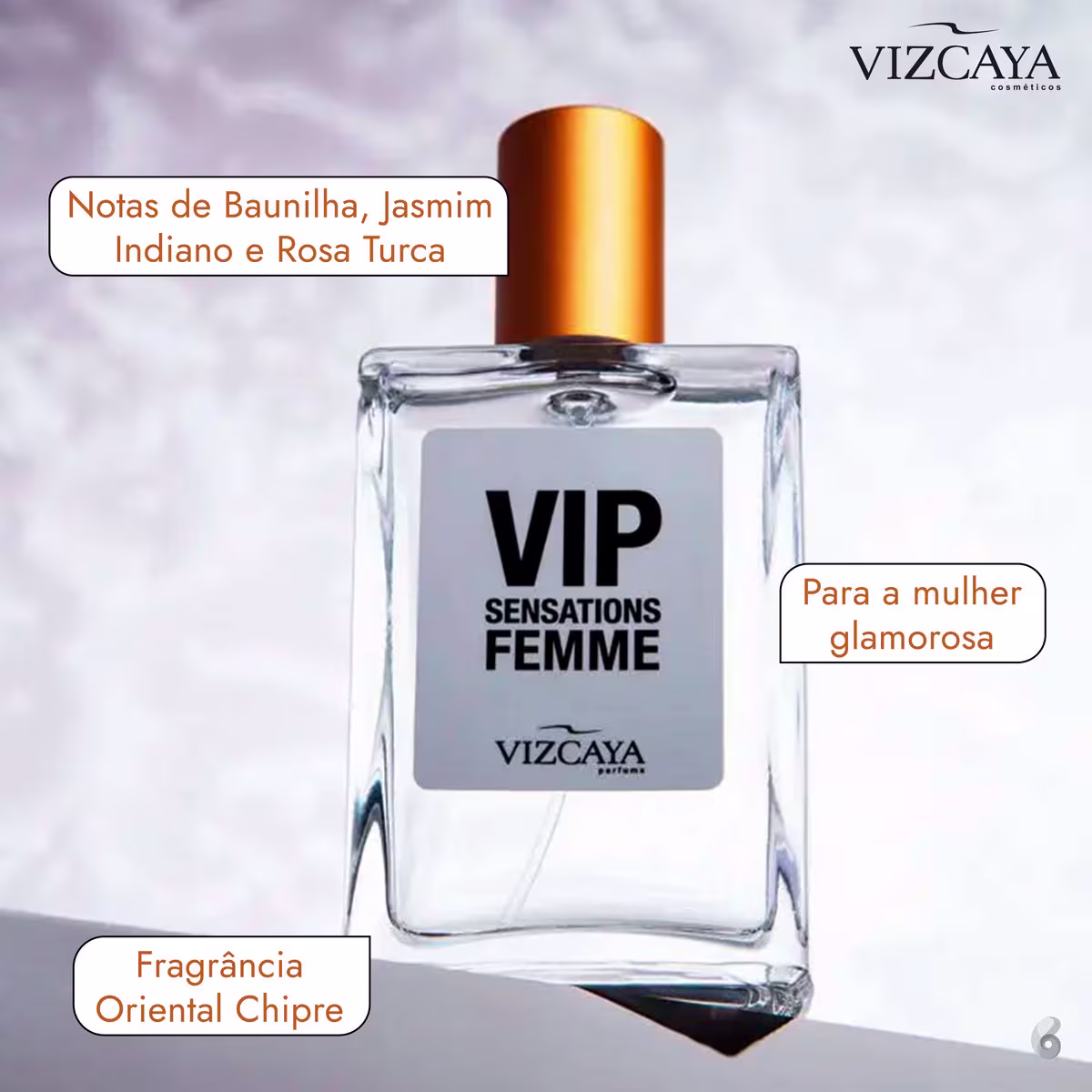 O Perfume Feminino VIP Sensations Femme, de Vizcaya, enaltece e reúne o que há de mais sofisticado nas famílias orientais e chipre. Abre com os aromas de Pêra, Cassis e Bergamota, ganha vida com a Rosa Turca, o Lírio do Vale, a Rosa de Maio e o Jasmim Indiano, e finaliza com a Baunilha e Musk Branco, para uma perfumação irresistível.