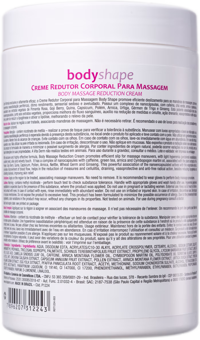 O Creme de Massagem Vita Derm Body Shape Redutor conta com textura suave e não oleosa, capaz de proporcionar alto rendimento e perfeito deslizamento das mãos. Com ingredientes poderosos na fórmula, como Cafeína, Óleo de Chá Verde, Goji Berri, Nicotinato de Metila e Extrato de Pimenta Rosa, o produto atua como um importante estimulante metabólico e lipolítico.