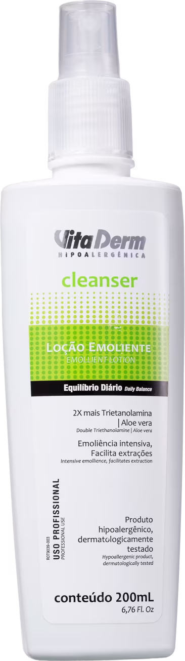 Loção hidratante facial para todos os tipos de pele. Vita Derm Cleanser Emoliente promove emoliência intensiva e facilita extrações, além de assegurar o perfeito equilíbrio cutâneo.