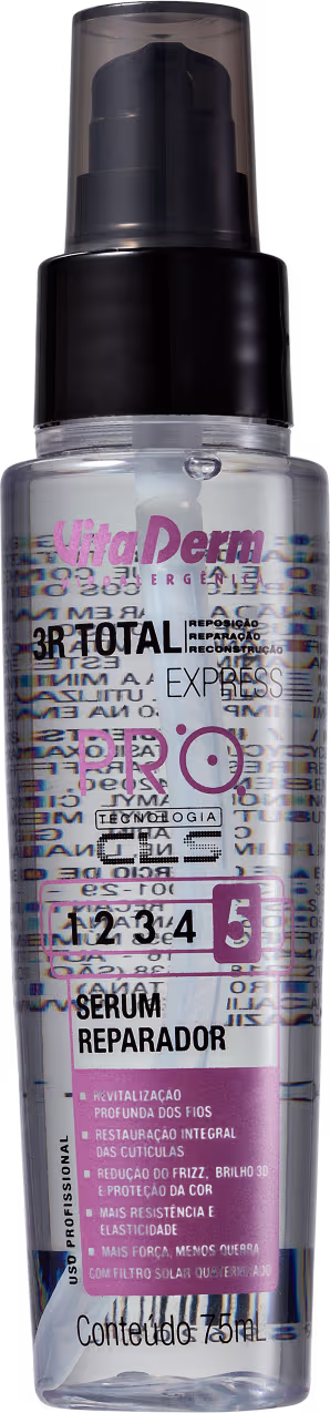 O Sérum Reparador de Pontas Vita Derm SOS Capilar 3R Total Express 5 chegou para tornar a sua rotina de cuidados capilares muito mais prática e eficiente. Com fórmula inteligente e exclusiva, que conta com ingredientes poderosos na composição, o produto oferece proteção da cor, impede a ação danosa dos raios solares, previne a quebra, restaura as cutículas e revitaliza a fibra capilar.