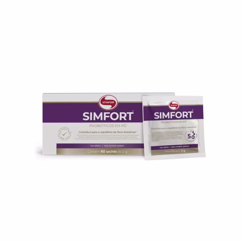 O Suplemento Vitamínico Vitafor Simfort contém 5 bilhões de probióticos por dose (Lactobacillus acidophilus, Lactobacillus casei, Lactococcus lactis, Bifidobacterium bifidum e Bifidobacterium lactis), liofilizados e altamente concentrados, que atuam em sinergia para auxiliar no equilíbrio da flora intestinal. Resistente ao pH do estômago, SIMFORT® chega vivo ao intestino, contribuindo para a saúde digestiva e a absorção de nutrientes.
