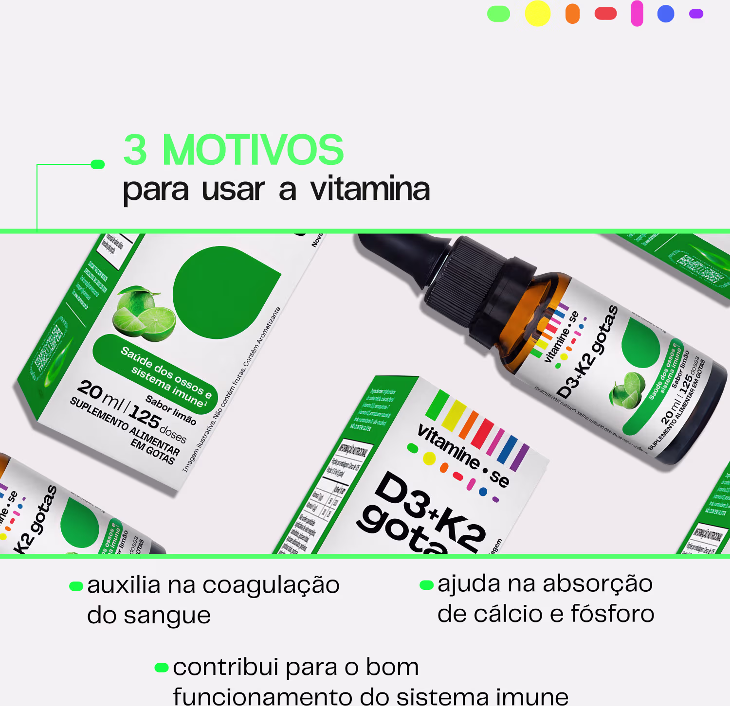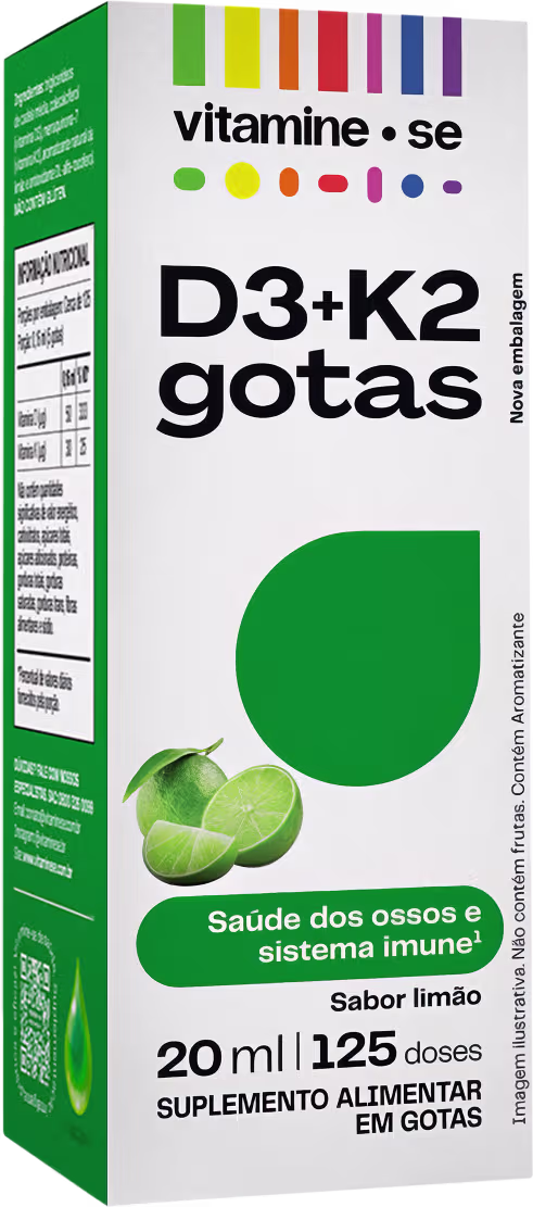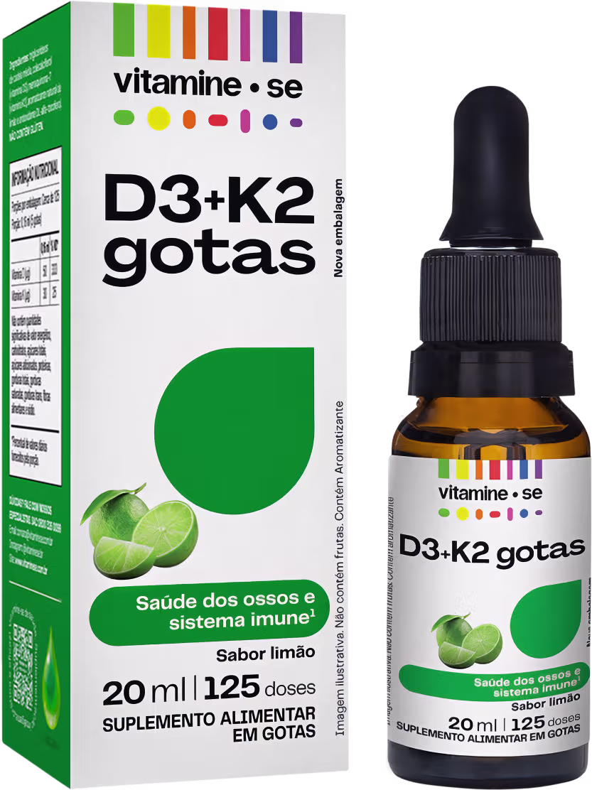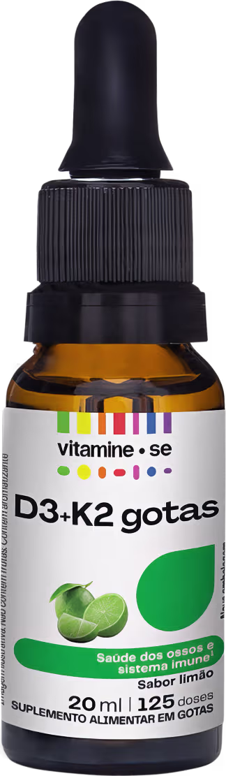 O Suplemento Alimentar Vitamine-se Regular D3+K2 em Gotas (Mk-7) conta com Vitamina D3, que ajuda na absorção e fixação do Cálcio no organismo. Em parceria com a Vitamina K2, a fórmula ainda direciona o nutriente para os locais certos, como é o caso dos dentes e ossos.