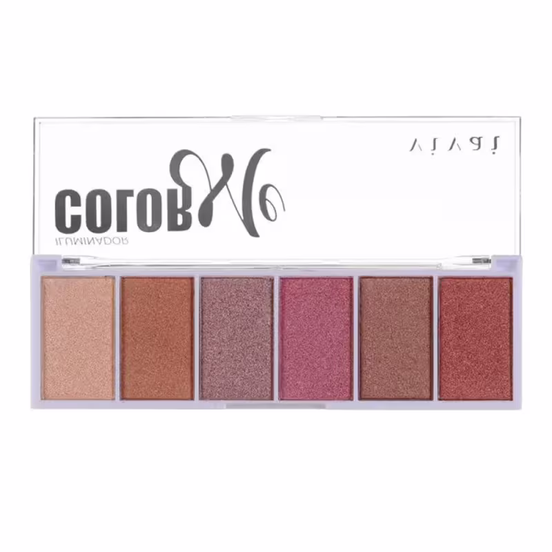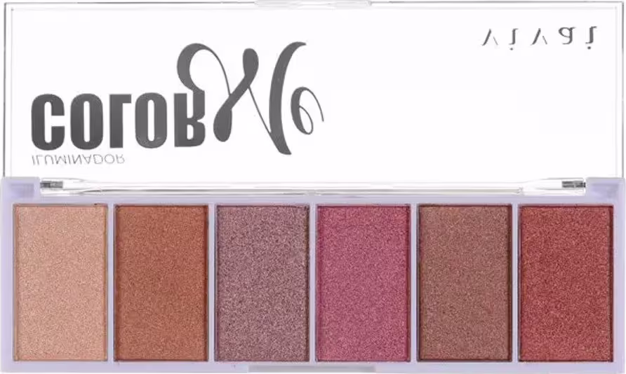 Paleta de iluminadores com seis cores. Vivai Color Me é super versátil, sendo ideal para diversos tons de pele.