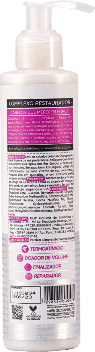 O Complexo Restaurador Vizeme Queraplus é indicado para quem busca reestruturar a fibra capilar e combater o ressecamento. Produto desenvolvido para devolver o aspecto saudável ao cabelo. Traz fórmula rica em queratina, um dos principais componentes da estrutura capilar, além de óleo de coco que hidrata e confere maciez ao cabelo.