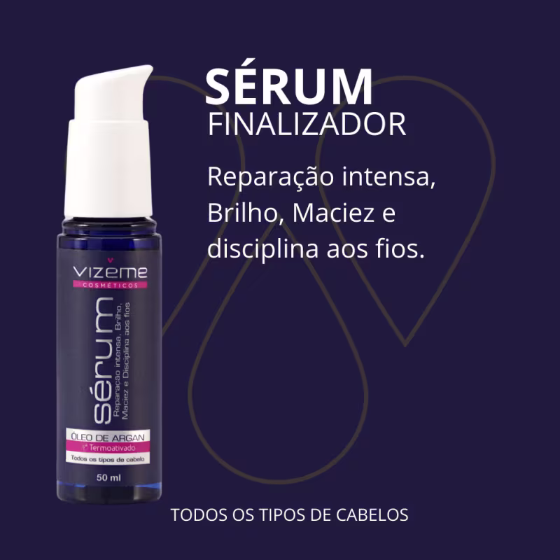 O Sérum Vizeme é um finalizador superconcentrado que combate o ressecamento. Proporciona um intenso e poderoso tratamento cosmético capilar. A formulação é rica em ativos de reparação, hidratação e disciplina aos fios, além do óleo de Argan com múltiplos benefícios.
