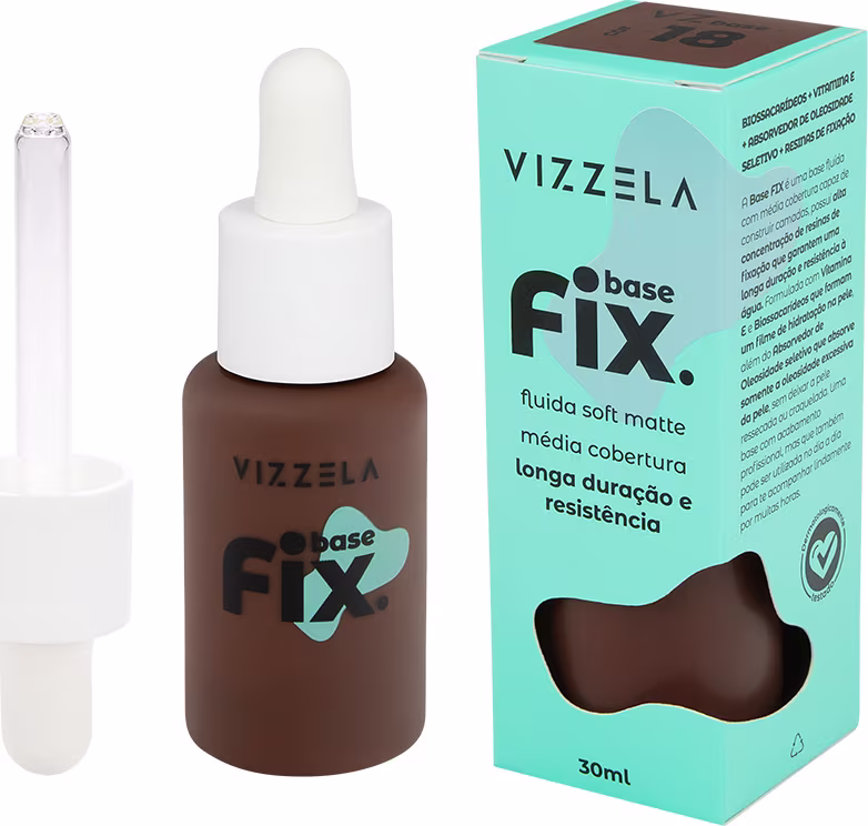 A Base Líquida Vizzela Cosméticos Fix apresenta fórmula tecnológica com Vitamina E e Biossacarídeos que formam um filme de hidratação na pele, e o Absorvedor de Oleosidade que absorve somente a oleosidade excessiva, sem deixar a pele ressecada ou craquelada. Possui acabamento profissional capaz de construir camadas e longa duração. A linha Fix segue a cartela de cores das bases Matte e Satin para facilitar na escolha.