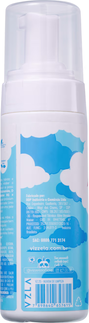 Espuma de Limpeza Vizzela Cosméticos Nuvem de Limpeza possui uma fórmula com ativos como Niacinamida, Pró-vitamina B5 e Extrato de Algodão, que garantem uma higienização eficaz sem agredir a pele, além de ajudar a controlar a oleosidade, desobstruir os poros e oferecer ação hidratante.