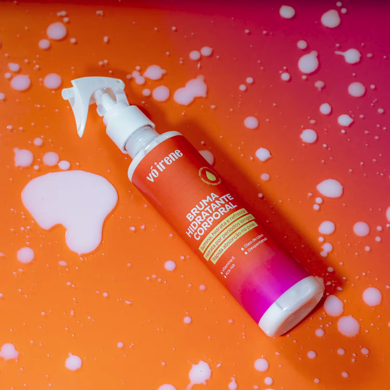 Bruma hidratante corporal. Vó Irene promove uma hidratação prolongada, deixando a pele suave e iluminada.