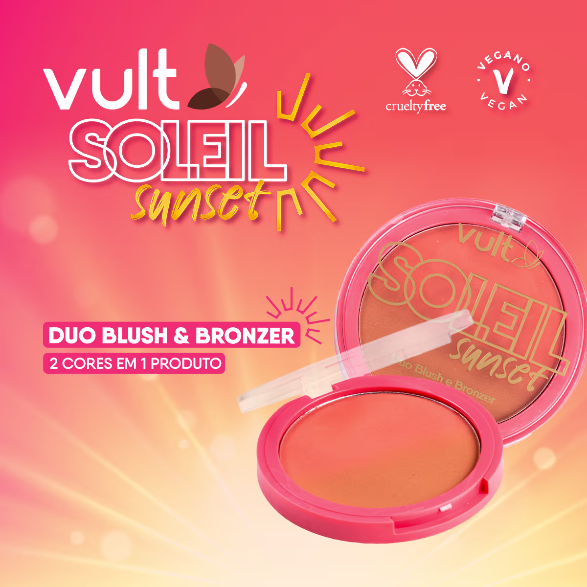 O Duo Blush e Bronzer Vult Soleil Sunset traz versatilidade para a sua make, em uma combinação de cores que é a cara do verão. Em edição limitada, esse item da Coleção Soleil Sunset traz 2 cores em 1 produto: permite a construção de uma cor customizada em um degradê de cores que se mesclam e entregam uma cor incrível..