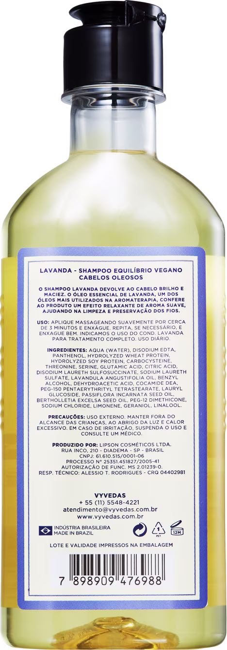 Shampoo para cabelos oleosos. Vyvedas Lavanda promove limpeza, brilho e maciez aos fios com aroma suave e relaxante.