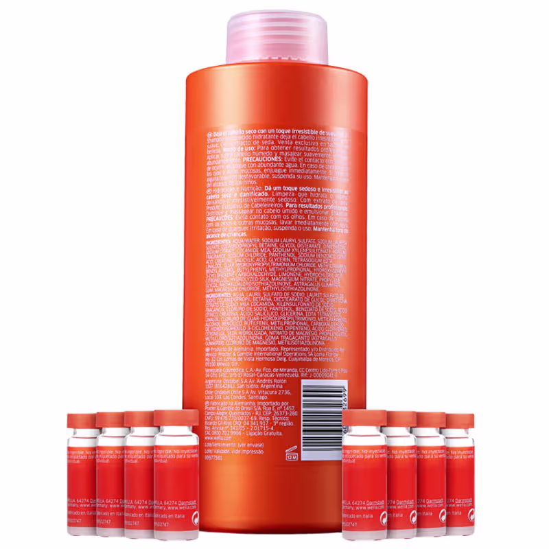 1. Wella Professionals Enrich Shampoo 1000ml: shampoo para cabelos secos e danificados. Limpa com delicadeza, removendo as impurezas sem ressecar. Ajuda a controlar, hidratar, nutrir e reparar os fios fragilizados, sem deixar o cabelo pesado. 2. Wella Professionals Enrich Repair Serum - Tratamento 8x10ml: ampola de tratamento intensivo para cabelos ressecados e danificados. Essa injeção de nutrientes repara intensamente o ressecamento e os danos acumulados, mantendo os fios hidratados, macios e brilhantes, leves e soltinhos.